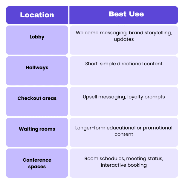 Digital signage shouldn’t be placed where you have space—it should be placed where people naturally look, pause, or make decisions.