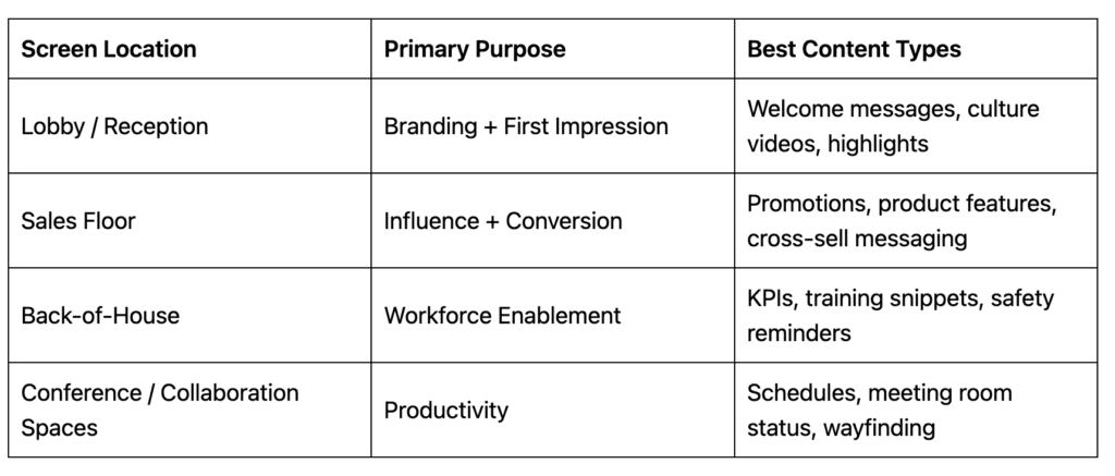 If you haven’t yet standardized screen placement, consider reviewing best practices for screen visibility, dwell zones, and sightlines before finalizing your content plan.